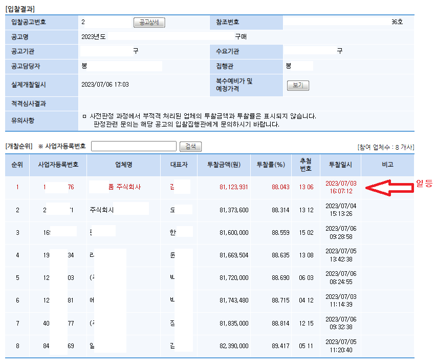 1등한 업체가 투찰금액 81,123,931, 투찰률 88,043, 추첨번호 13,06 으로 1등이 되었네요